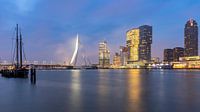 Ochtendfoto van de verlichte Erasmusbrug van Ben van Berkel over. Aan de overzijde van de Maas de moderne hoogbouw van de Kop van Zuid. Van rechts naar links De Rotterdam van Rem Koolhaas, de KPN toren en de toren van Deloitte. Links naast de Erasmusbrug is de historische hefbrug nog net zichtbaar