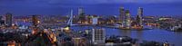 Avondfoto van Rotterdam met de Nieuwe Maas en de Erasmusbrug vanaf de Euromast. Panoramafoto die samengesteld is uit 6 opnamen.
