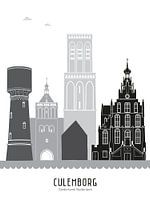 Culemborg, Gelderland: dan denkt Mevrouw Emmer aan de Lanxmeerpoort -Binnenpoort, het stadhuis, de Sint-Barbarakerk en de watertoren.