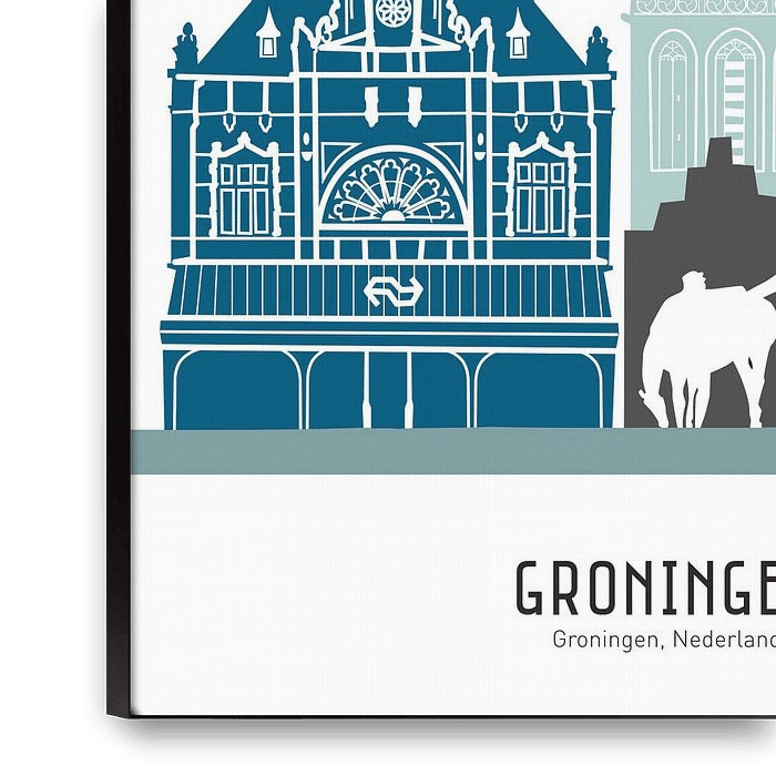 Koop dit abstracte kunstwerk Skyline illustratie stad Groningen in kleur van Mevrouw Emmer op canvas, aluminium dibond, (ingelijste) fotoprint, behang en ArtFrame, op maat geprint in Fine-Art kwaliteit.