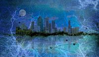 Skyline in de winter. Winters tafereel bij nacht. Digitale beeldbewerking. met texture. Surrealistisch landschap bij volle maan. De wolkenkrabbers worden weerspiegeld in de ijsvlakte.