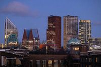De skyline van Den Haag tegen een roze-blauwe lucht. De iconische gebouwen die iedereen Hagenaar uit duizenden herkent.