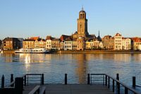 Skyline van Deventer aan de IJssel tijdens zonsondergang. Met oude huizen aan de Welle en de aanlegsteiger van de veerpont op de voorgrond. Op de achtergrond de karakteristieke Grote of Lebuïnuskerk, een gotische hallenkerk. In de Middeleeuwen was het de hoofdkerk van de stad en een van de voornaamste kerken binnen het bisdom Utrecht.…