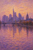 De schemering omhult Frankfurt, waar glazen torens als lantaarns boven de Main glinsteren. De moderne skyline van de stad, weergegeven door impressionistische ogen, wordt een studie in toon en temperatuur - violette schaduwen ontmoeten abrikooskleurige gloed.