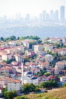 Uitkijken over de heuvels van Istanboel, Turkije. Op de voorgrond van dit uitzicht over de stad zie je een kleurrijke wijk met woongebouwen. De daken zijn rood, oranje en roze van kleur. Op de achtergrond de moderne skyline van de stad met skyscrapers. Tussen de gebouwen piept het groen tevoorschijn. Midden tussen de woningen valt op…