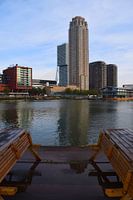 Skyline van Kop van Zuid in Rotterdam en de rivier de Maas na een regenbui, met een verlaten picknickbankje op de voorgrond