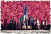 Digitaal schilderij, in de stijl van Vincent van Gogh met de voor hem zo bekende "swirly clouds", met de skyline van New York.