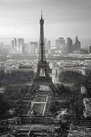 Deze indrukwekkende zwart-witfoto toont het fascinerende perspectief van Parijs vanuit het oog van een drone. Op de voorgrond is het beroemde gebied rond de Eiffeltoren te zien, met de elegante lijnen van de stad en de opvallende gebouwen die zich uitstrekken tot aan de horizon. Van de Ecole Militaire in het zuiden tot de moderne wijk La Défense in het westen biedt de foto een uniek beeld van de diverse architectuur en het stadsleven van de Franse hoofdstad. Het monochrome kleurenschema onderstreept de tijdloze schoonheid en stedelijke charme van dit iconische Parijse landschap.