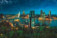 Dit expressieve kunstwerk toont de adembenemende skyline van Rotterdam gezien vanaf de Euromast. De Erasmusbrug, Kop van Zuid met het iconische hotel New York, en het Park vormen slechts enkele van de vele kenmerkende elementen die tot leven komen in dit geschilderde werk.