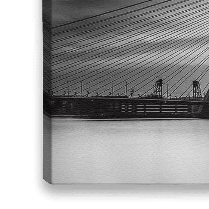 Skyline van Rotterdam met de kop van zuid in panorama en in zwart-wit, met onder andere de Erasmusbrug en het kantoorgebouw " De Rotterdam ". Stadsgezicht van Rotterdam