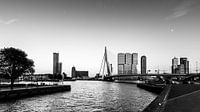 Skyline van Rotterdam met De Rotterdam, De Erasmusbrug en verder zicht op de Zuid oever. In zwartwit en een strakke lucht waar in de verte de maan is te zien. Aan de overzijde is een nog altijd groeiend stadsdeel te zien met mooie architectuur.