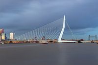 Avondfoto van de skyline van Rotterdam met de kantoorgebouwen, de Erasmusbrug en 'De Hef'.