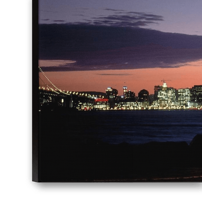 De schemering valt over de baai terwijl het centrum van San Francisco oprijst in een helder reliëf. Elke toren vangt de laatste kleur van de dag terwijl het water een gepolijste glans krijgt. De scène brengt zachte hemelgradiënten in evenwicht met scherpe architecturale lijnen, waardoor de stad verandert in een afgemeten ritme van vormen en licht. Subtiele reflecties breiden de skyline naar beneden uit, waardoor een kalme symmetrie ontstaat die uitnodigt tot een ongehaaste blik over de horizon.