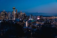 De skyline van Seattle tijdens het blauwe uur met de Space Needle en Mount Rainier die door de wolken pieken.