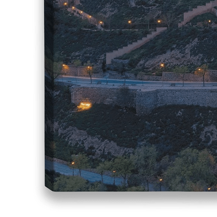 Een avond tijdens zonsondergang met het uitzicht vanuit Mirador Panoramico op de Kathdraal en het Alcazar van Toledo, een stenen fort dat gelegen is op het hoogste punt van de Spaanse stad Toledo.
