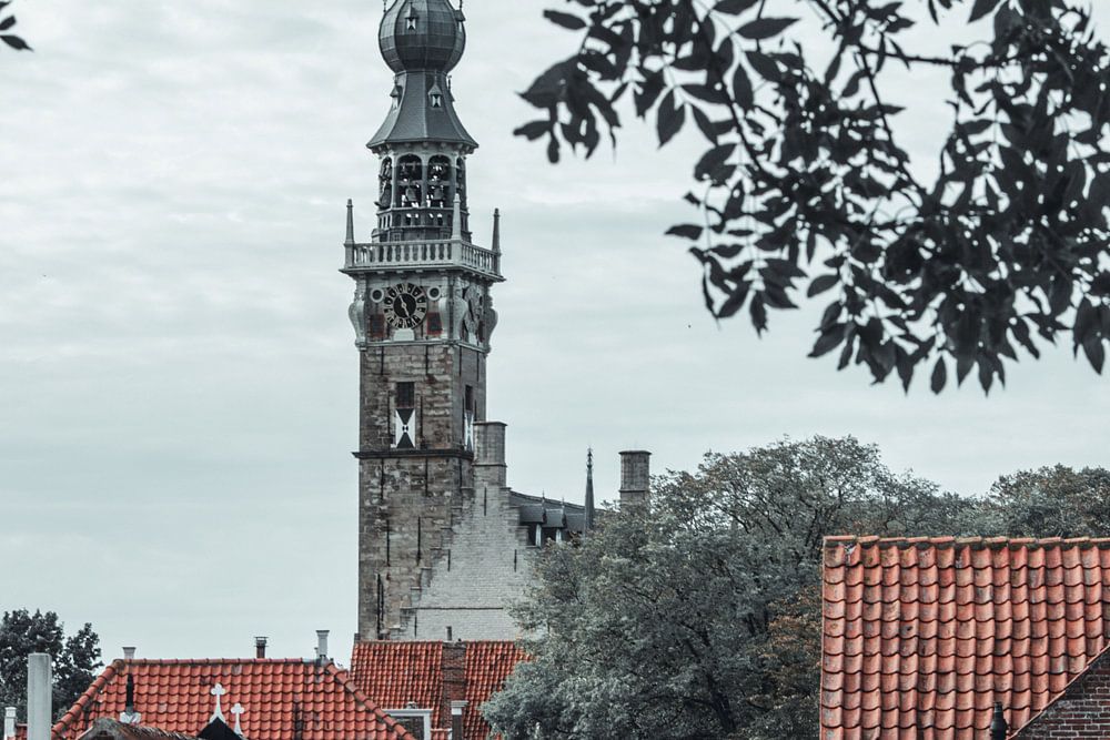 Deze foto laat de skyline van Veere (Zeeland) zien. Doordat het accent op de oranje daken van het dorp ligt, is het contrast tussen de lucht en de daken groter. Doordat je door de bladeren heen kijkt lijkt het alsof je in de natuur zit. Veere is een historische stad. Het heeft ongeveer 1600 inwoners. het bestaat sinds de 13e eeuw.