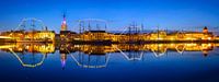 Avond over de skyline van de Hanzestad van Kampen in Overijssel, Nederland. De lichten van de stad worden weerspiegeld in het kalme water terwijl de lucht direct na zonsondergang blauw is geworden. Zeilschepen van de bruine vloot liggen aangemeerd aan de IJsselkade.