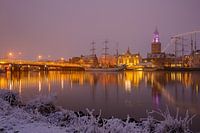 Avondzicht op de skyline van de stad Kampen in Overijssel. De lichten van de stad worden gereflecteerd in het rustige water, terwijl de lucht direct na zonsondergang blauw is geworden. Op de pier op de voorgrond ligt sneeuw.