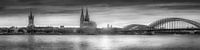 Zonsondergang in Keulen aan de Rijn als bijzonder brede skyline-panoramafoto in zwart-wit.