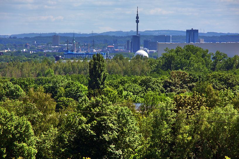 Uitzicht vanaf een groene slakkenberg in Dortmund Schwieringhausen in de richting van de Dortmundse skyline
