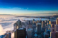 Uitzicht vanaf de Columbia Tower, Seattle met laaghangende bewolking.