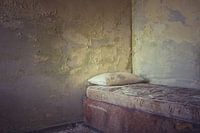 Slaapzaal in oud ziekenhuis in Italie. De bomen groeien door het gebouw heen. Het verval heeft zijn plek genomen in het gebouw.
