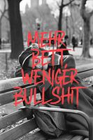 Deze zwart-wit poster toont een slapende persoon op een bankje in het park met de geestige slogan "More bed, less bullshit" in felrode letters. Een echte blikvanger voor fans van street art en brutale boodschappen die humor en artistieke expressie waarderen.