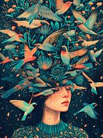 Het toont het portret van een jonge vrouw, haar gezicht vredig met gesloten ogen, omhuld door een levendige zwerm vogels en weelderige planten. De vogels, met hun uiteenlopende tinten van blauw en oranje, lijken rondom haar hoofd te cirkelen en vormen een dynamische, bijna bewegende kroon. De achtergrond is donker, waardoor het kleurrijke palet van de vogels en planten nog meer in het oog springt. Het geheel creëert een sfeer van droomachtige sereniteit en symbiose tussen mens en natuur.