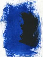 Minimalistisch abstract met brede, dynamische vegen in kobaltblauw en zwart. De compositie is energiek en vloeiend, met een kleine witte vlek die de zwarte lijn doorbreekt en een moment van kalme focus creëert. Het werk benadrukt beweging, contrast en ingehouden kleur voor een moderne, evenwichtige uitstraling.