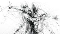 Deze zeer abstracte, dynamische lijntekening toont vechtende mannen in een intense confrontatie. De krachtige lijnen en dynamische opstelling geven de energie en beweging van het gevecht weer. De abstracte vormen en patronen versterken de intensiteit van de scène en creëren een sfeer van spanning en conflict. Hoewel de afbeelding sterk vereenvoudigd is, is de emotionele intensiteit van het gevecht duidelijk herkenbaar. De lijnen lijken de rauwe kracht en vastberadenheid van de vechters uit te drukken. Deze afbeelding nodigt de kijker uit om geïnspireerd te raken door de krachtige esthetiek van het gevecht en na te denken over de dynamiek van menselijke interactie.