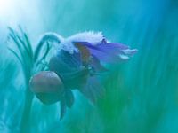 Slak (of buikpotigen/Gastropoda) aan de wandel op bloem Wildemanskruid (Pulsatilla vulgaris). In blauw groene omgeving.
