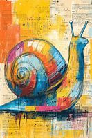 Slak met Spiraalvorm - Op dit schilderij van een slak zie je een grote, kleurrijke slak met een spiraalvormige schelp, omringd door felle kleuren zoals oranje, geel en blauw, wat het geheel een moderne en vrolijke uitstraling geeft.