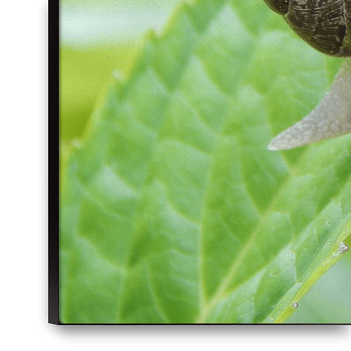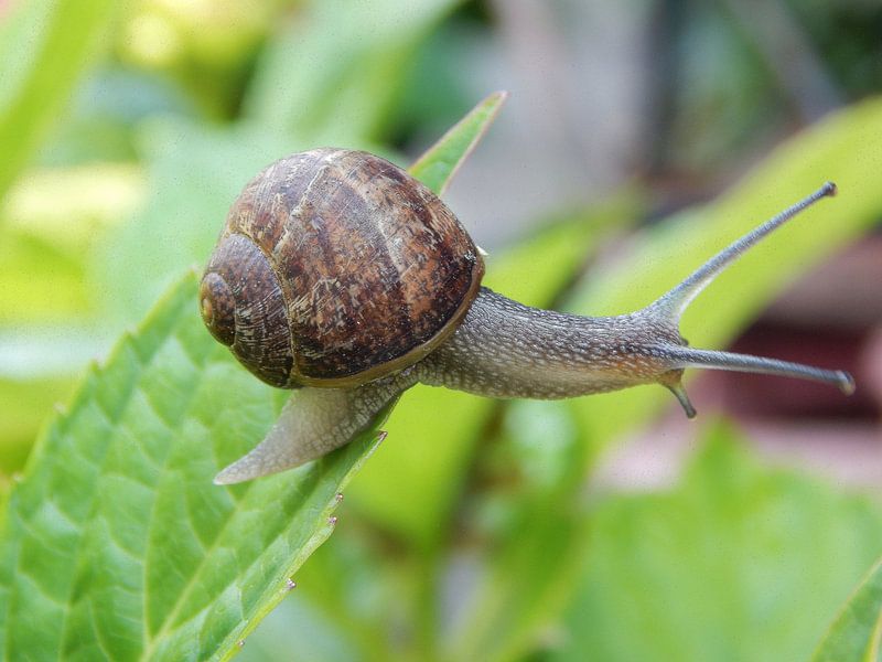 Slak op een blad , buitenleven mooi als poster of behang, geeft je een rustige ruimte in huis, werk aan de muur