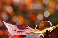 De avondzon schijnt wanneer ik deze slak tegen kom in de tuin. Er is scherp gesteld op 1 van zijn tentakels/oog. Op de achtergrond is een prachtig kleurrijk bokeh te zien met warme herfstkleuren.