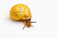 Gewone tuinslak met een geel huisje op een witte achtergrond.