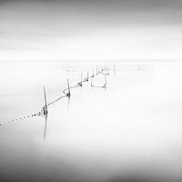 Zwart-wit foto met lange belichting van visnetten. Lagune van Orbettello, Toscane