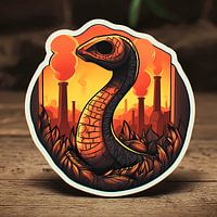 Uit een bed van donkere bladeren rijst een eenzame slang op, die zich omhoog kronkelt tegen een brandende industriële skyline. Achter haar spuwen torenhoge schoorstenen wolken uit in een stralende hemel van gesmolten oranje en vervagend goud – een horizon die meer door machines dan door de natuur wordt gekenmerkt.
