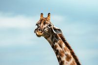 Betrapt tijdens het eten - zo kijkt de giraffe in de camera terwijl hij kauwt.