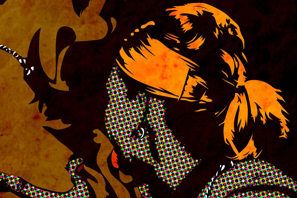 Het werk toont twee gestileerde vrouwenfiguren in een intieme omhelzing, gerealiseerd in een minimalistische vectorafbeelding met donkere kleurtinten en felle accenten in oranje en geel. De scène ziet eruit als een bevroren moment van een lange, slapeloze nacht - sensueel maar niet expliciet, grafisch gereduceerd en toch expressief.