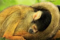 Karakteristieke houding van een doodshoofd aapje met zijn staart om zich heen terwijl hij aan het slapen is op de tak van een boom.