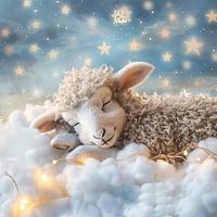 Deze betoverende illustratie toont een slapend lammetje, genesteld op zachte wolken onder een fonkelende sterrenhemel. De zachte pastelkleuren en gedetailleerde weergave van de sterren creëren een dromerige en rustgevende sfeer, perfect voor een kinderkamer. Ideaal voor ouders die op zoek zijn naar een liefdevolle en magische muurkunst om een vredige omgeving voor hun kinderen te creëren. Een prachtig cadeau voor dierenliefhebbers en een charmante toevoeging aan de wereld van elk kind.