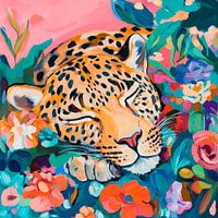 Een dromerige jaguar rust midden in een kleurrijke bloemenzee en wordt omringd door zachte zonnestralen. Zijn heldere vacht, met een patroon van diepzwarte en warme goudtinten, harmonieert perfect met de levendige kleuren van de omgeving. Dit vredige tafereel straalt een aura van rust en natuurlijke schoonheid uit, terwijl de vrolijke bloesems om hem heen zorgen voor levenslust.
