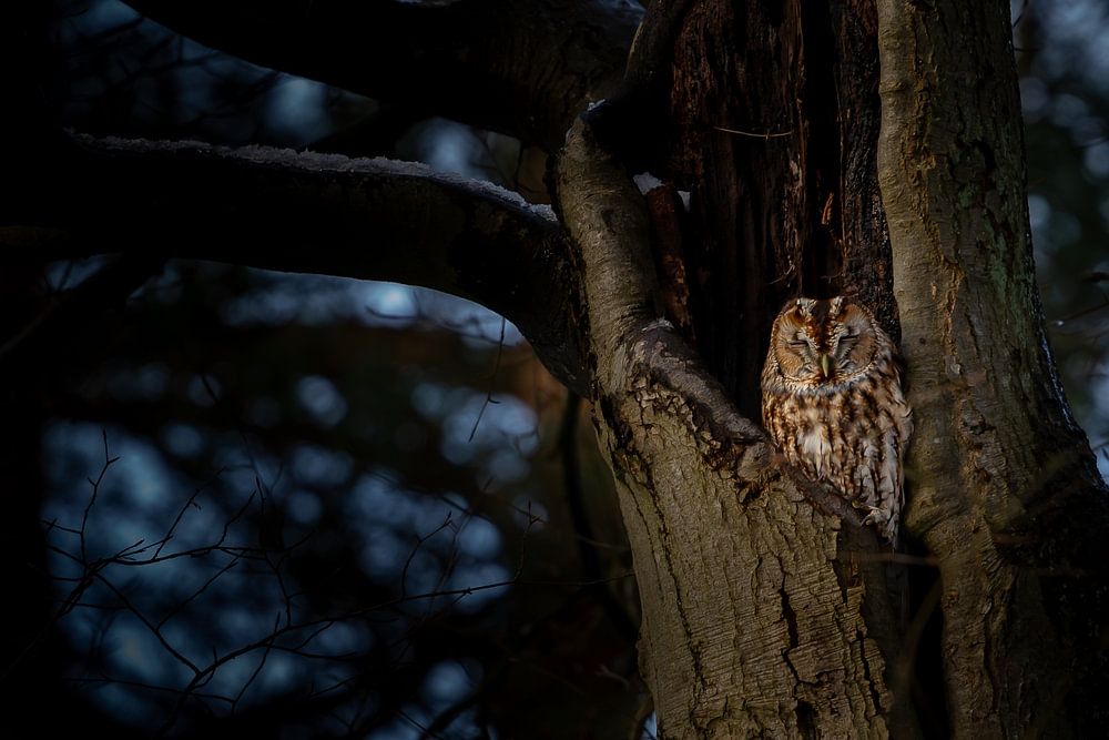 Een slapende bosuil in een oude boom. Het wordt bijna donker dus tijd om op te staan.