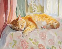 Slapende Kat - Dit kat schilderij toont een sereen slapende, oranje-witte kat op een bloemrijk pastelkleurig dekbed, met zachte achtergrondkleuren die een rustig en warm huiselijk gevoel geven.