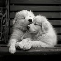 De afbeelding toont twee Pyrenese Berghond-puppy's die liefdevol naast elkaar liggen en genieten van een diepe slaap. Hun sneeuwwitte vachten glanzen in het licht, terwijl hun donkere neuzen en gesloten ogen rustige ontspanning uitstralen. De harmonie tussen de slapende broertjes of zusjes is duidelijk voelbaar, een tafereel van gedeelde warmte en geborgenheid. Deze vertederende pups beloven een toekomstige vriendschap en loyaliteit die dieper gaat dan hun rustige dromen.
