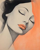 Slapende Schoonheid - Het portret biedt een intieme kijk op een persoon in profiel, met een serene expressie en gesloten ogen. De zachte potloodtinten geven een subtiel contrast tegen de levendige achtergrond van 'Peach Fuzz'. De minimalistische stijl benadrukt de sierlijke lijnen en de rustige sfeer van het stuk.