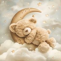 Deze betoverende muurschildering toont een pluizige teddybeer die vredig slaapt op zachte wolken onder een fonkelende sterrenhemel. De zachte, pastelkleurige achtergrond creëert een rustgevende en liefdevolle sfeer, ideaal voor kinderkamers of kinderdagverblijven. Perfect voor ouders die een warme en dromerige omgeving willen creëren voor hun kleintjes. Een liefdevol accent dat kinderen meeneemt naar een wereld vol geborgenheid en dromen.
