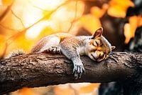 Deze prachtige afbeelding toont een eekhoorn die ontspannen slaapt op een boomtak, omringd door warme herfstkleuren. De zonnestralen breken door de bladeren, wat een serene en dromerige sfeer creëert. Ideaal als decoratie voor een slaapkamer of andere ruimte waar rust en natuur samenkomen. Het hyperrealistische ontwerp geeft een bijna…