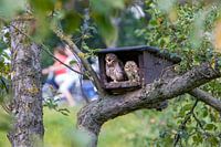 Twee jonge steenuiltjes zijn zich van geen kwaad bewust en dutten en dommelen gewoon door terwijl achter hen toeristen over de dijk fietsen