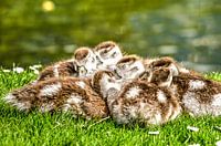 Groep jonge gansjes slapend in het gras bij een sloot. Of, nou ja, slapend: één oog blijft waakzaam geopend.